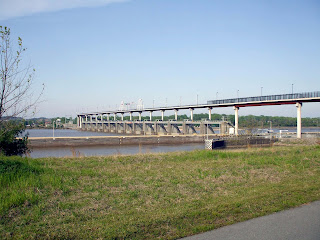 About to cross the little bridge. I walk to almost where the Big Dam Bridge starts to curve (left edge of the picture), it takes about 30 minutes to get to that point.Sometimes a train will pass by.